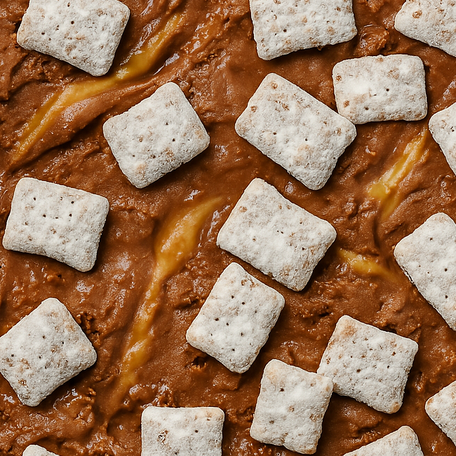 Milk chocolate base with homemade muddy buddy cereal mix with swirls of peanut butter.